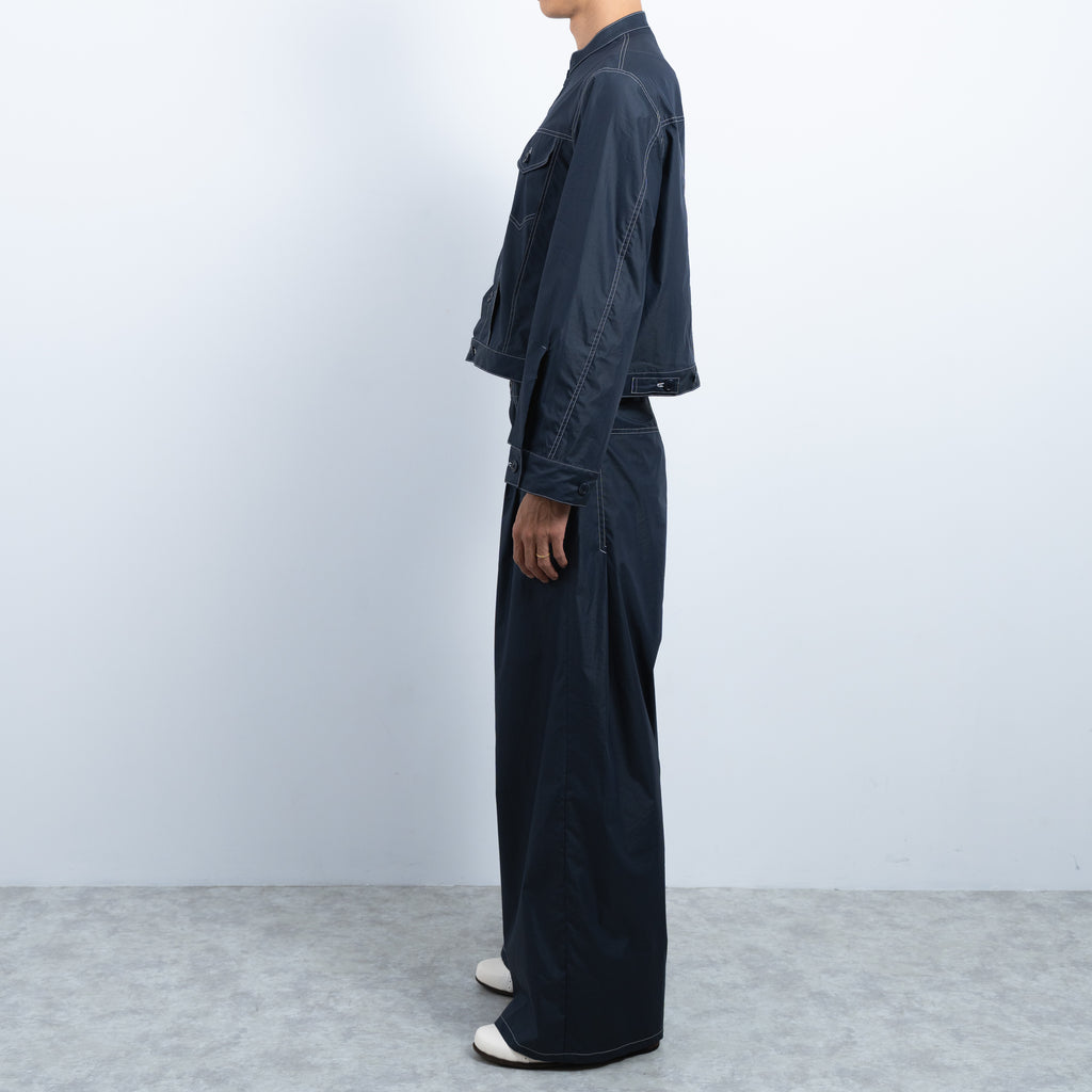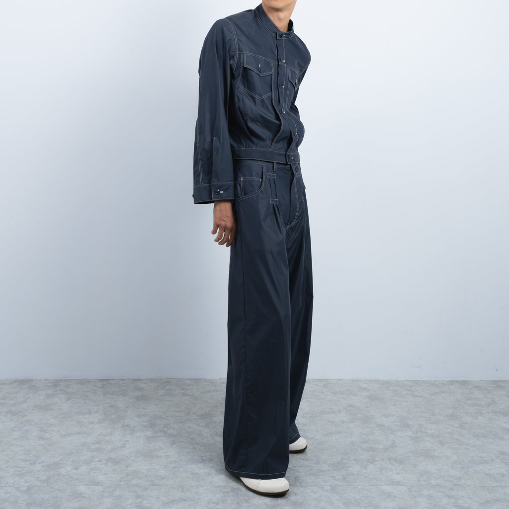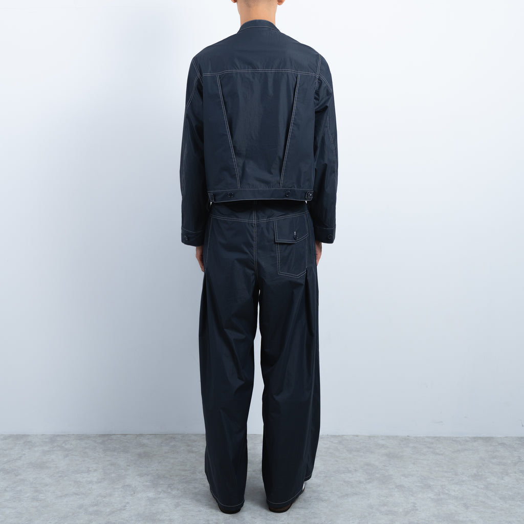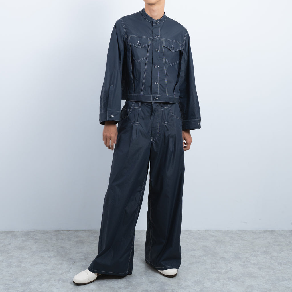特殊なバイオ加工、マイルドな光沢加工を施したハイカウントなタイプライターを採用し、TYPE 3のトラッカージャケットをベースに、アクションプリーツとステッチワークで変化を持たせた。