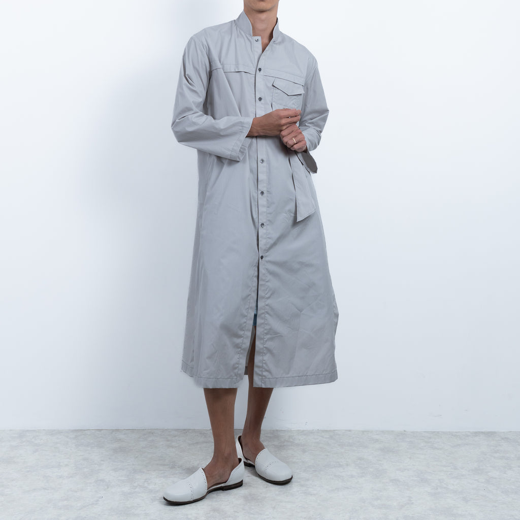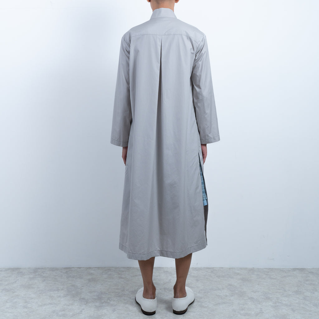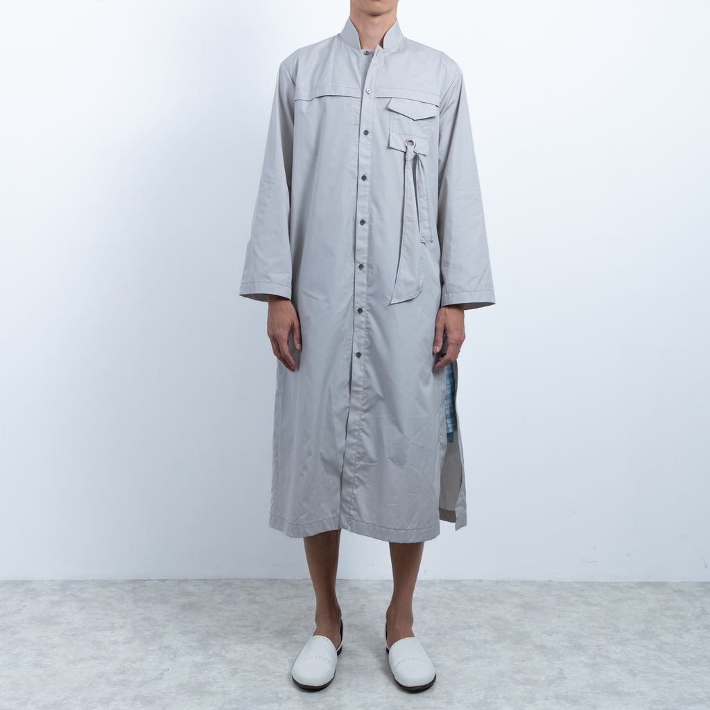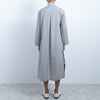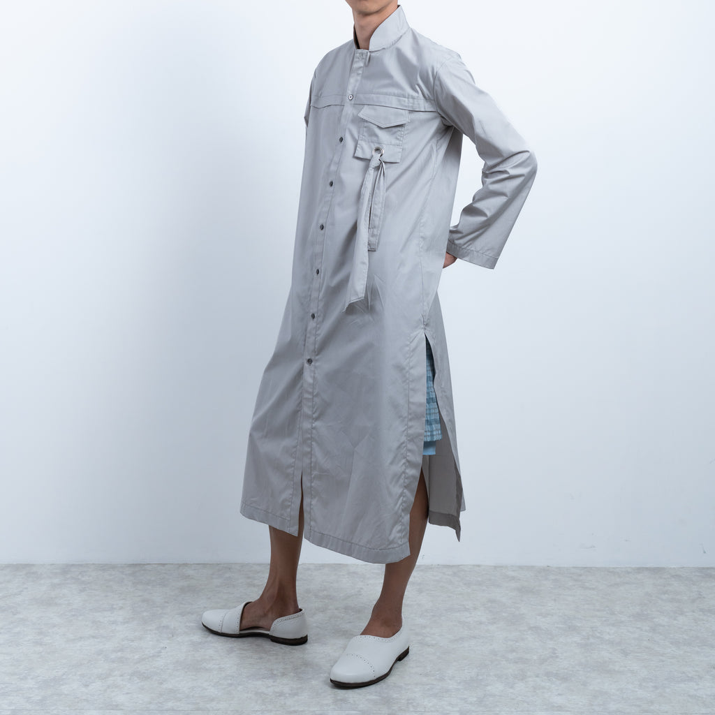 24SSシーズンで採用したステッチワークを用い、ハトメを打ったパッチポケット×タイの仕掛けを施した着丈130cのフルレングスシャツワンピース。