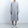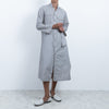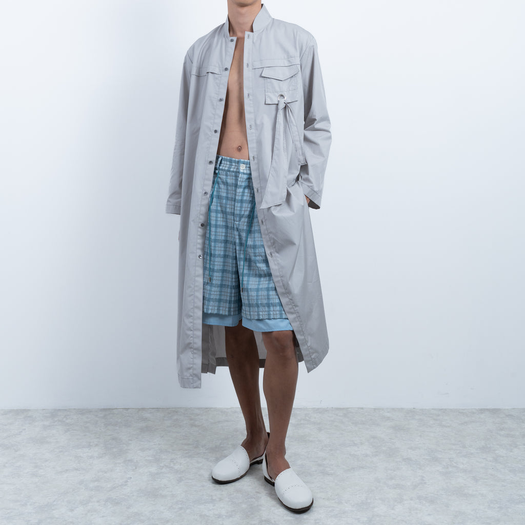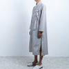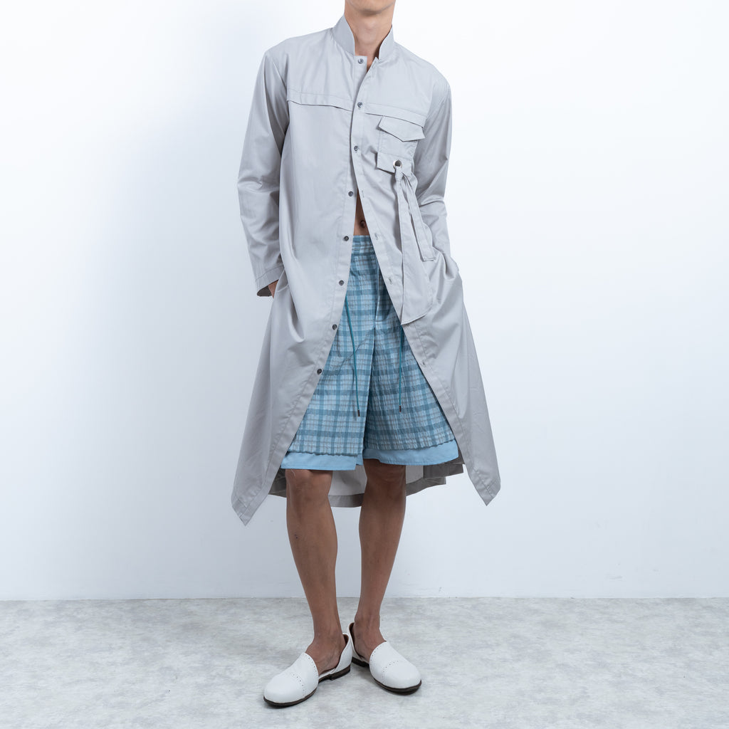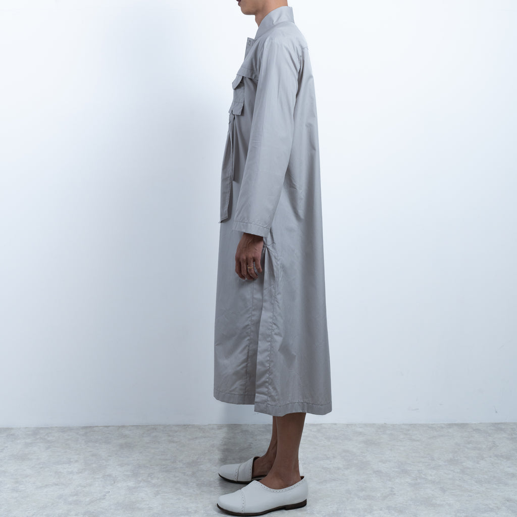 24SSシーズンで採用したステッチワークを用い、ハトメを打ったパッチポケット×タイの仕掛けを施した着丈130cのフルレングスシャツワンピース。