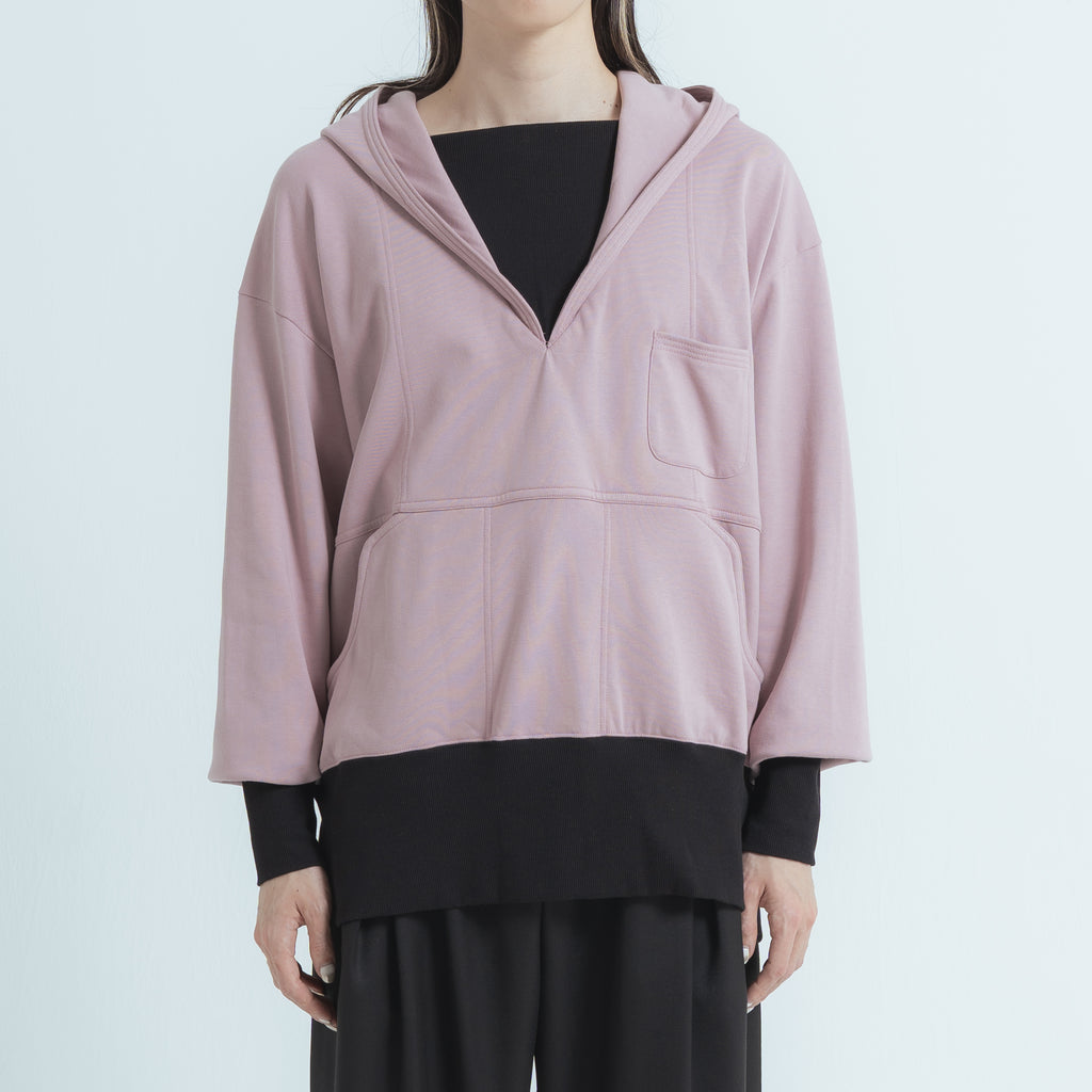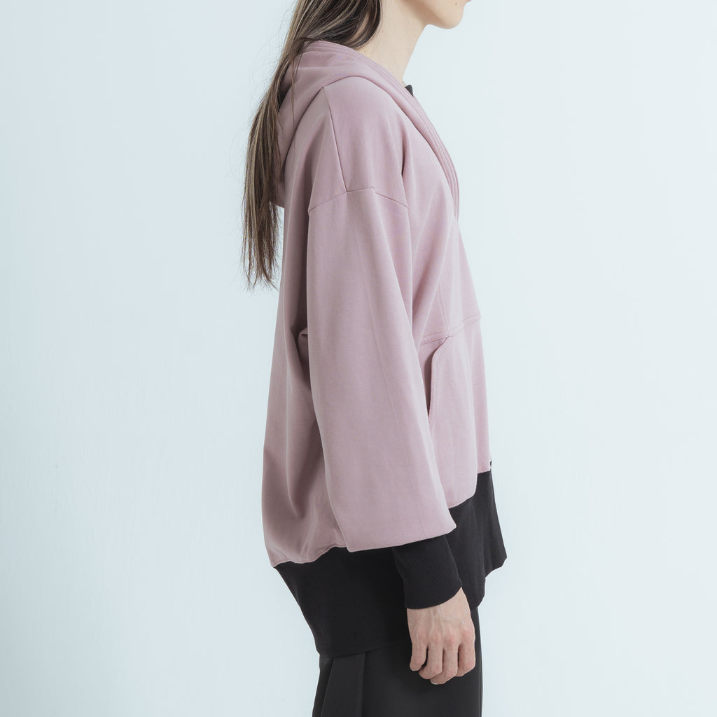 表地には適度な肉間の裏毛を採用、裾/袖口だけでなく胸当てにもフライスを使用し、伸縮性による着心地を補うとともにポイントとして効かせております。